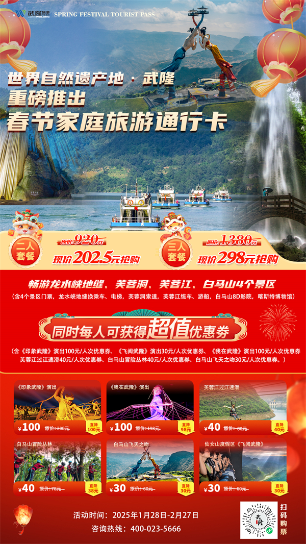 春節期間,優惠多多,樂享不停。《我在·武隆》行浸演藝將于1月31日(正月初三)盛大復演,@武隆居民,1月31日—2月27日,只需99元/3人家庭套餐優惠票,并贈送價值120元的喀斯特世界自然遺產博物館門票3張。