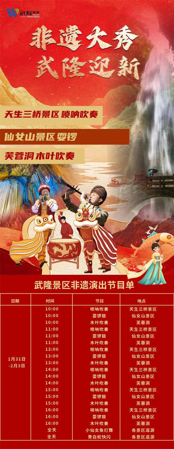 正月初二,武隆景區人氣滿滿,熱鬧非凡。當然,春節不完,活動不停。1月30日—2月3日,“隆蛇”共舞、芙蓉燈謎會、冰雪T臺SHOW、非遺演出、新春集市等活動將持續上演。這個蛇年,來武隆景區,逛集市、賞演出、品非遺,讓你的春節充滿煙火氣與文化味!