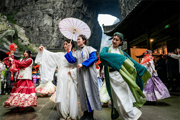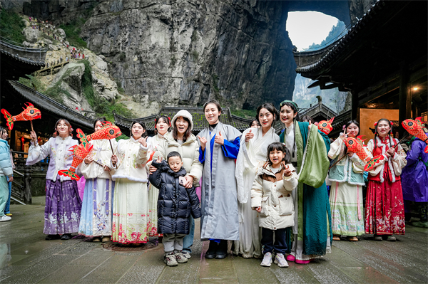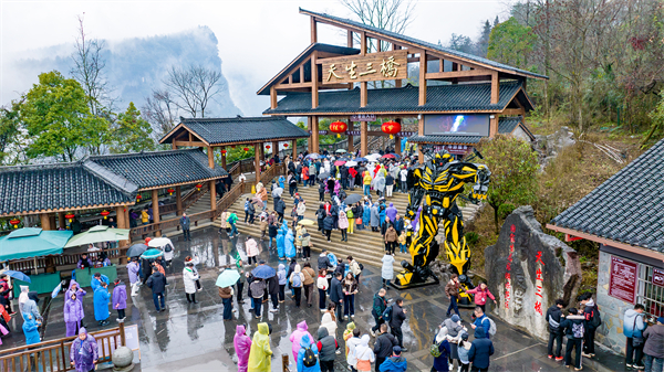 更幸運(yùn)的是,在這蛇年伊始,偶遇《白蛇傳》中的白娘子、許仙、小青三位傳奇人物,她們與游客親密互動,將蛇年的好運(yùn)與福氣傳遞給每位游客。一路向前,走過天龍?zhí)炜?、青龍橋、神鷹天坑、黑龍橋,游客們紛紛?ldquo;三橋夾兩坑”的奇特景觀所折服,并表示,“天生三橋果然名不虛傳,嗩吶聲與雄壯的奇景相得益彰,還接受了白蛇、青蛇賜福,蛇年萬事順?biāo)?rdquo;。