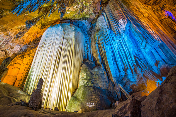 伴著清脆悅耳的木葉吹奏聲,游客們踏入芙蓉洞,觀賞“地下藝術(shù)宮殿”的奇幻景觀,“生命之源”“珊瑚瑤池”“巨幕飛瀑”等鐘乳石景觀,形態(tài)各異,各有千秋,讓人想住在這個(gè)五彩斑斕的童話世界。
