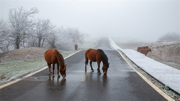 走進仙女山大草原,遠處的樹枝上、草叢間已經有了星星點點的白色,仿佛是大自然這位神奇的畫家,用白色的顏料隨意揮灑,勾勒出了一幅絕美的冬日畫卷。雨滴夾雜著細小的雪花飄落,打在身上,帶來絲絲涼意的同時,更增添了一份驚喜。在這里,你可以肆意奔跑,與這片純凈的白茫茫世界親密接觸,感受冬日特有的那份寧靜與祥和。此時,不妨拿出你的手機或相機,記錄下這難得一見的美景。