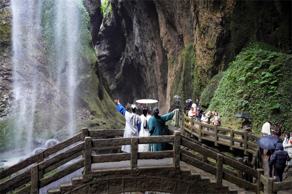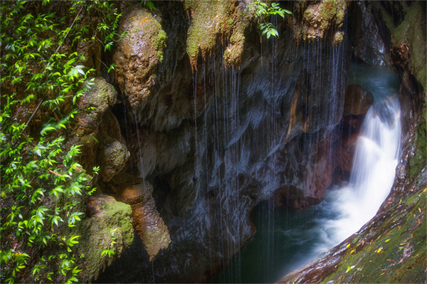 如果說天生三橋是大自然的雄壯贊歌,那么龍水峽地縫就是一首細膩柔和的抒情詩。沿著蜿蜒的棧道深入地縫,兩側是陡峭的崖壁,高達數百米,如刀削斧劈一般,陽光透過裂縫灑下斑駁光影,與清澈的溪流、形態各異的鐘乳石共同編織出一幅幅生動的畫面。