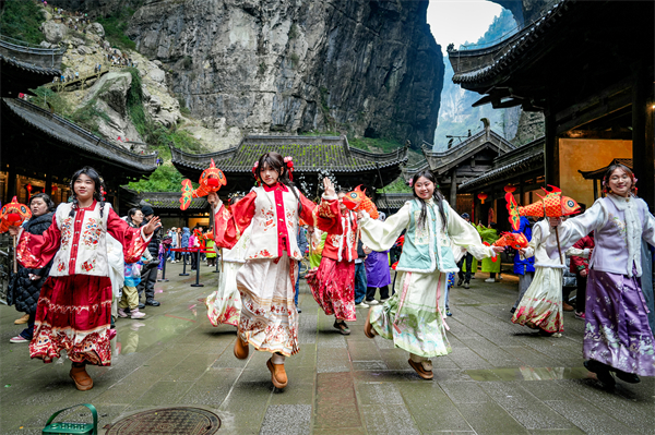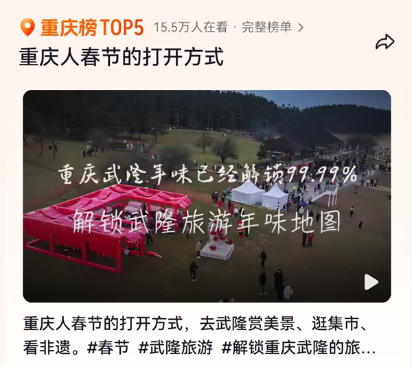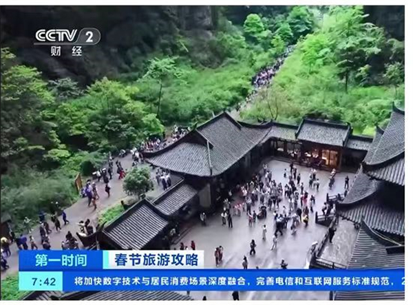 今年春節期間,武隆景區開展了以“中國年·武隆味—歡歡喜喜過大年”為主題的新春文旅活動,逛新春集市、與“靈蛇”共舞、猜芙蓉燈謎、賞非遺演出等春節傳統民俗體驗活動,引來全國游客如織,該活動的視頻登上了抖音重慶榜第五名。特別值得一提的是,武隆景區憑借超高人氣,再次“闖入”央視、重慶廣電等屏幕,先后被央視CCTV-2財經、重慶廣電-第1眼TV聚焦報道。