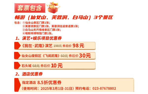 3月8日至3月9日,所有女性游客及同行男同胞3.8元暢游仙女山、芙蓉洞、白馬山天尺情緣共3個景區和喀斯特博物館。各位公主殿下和王子殿下,武隆已經敞開懷抱,等你大駕光臨!