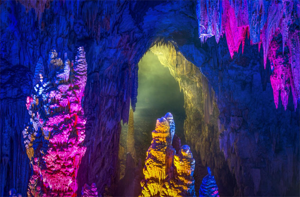 踏入芙蓉洞,仿佛進入了五彩斑斕的地下藝術宮殿。石筍、石柱、石幔姿態各異,珊瑚瑤池、巨幕飛瀑、生命之源、犬牙晶花池、石花之王等在燈光的映照下散發迷人色彩,如夢幻的水晶宮殿。