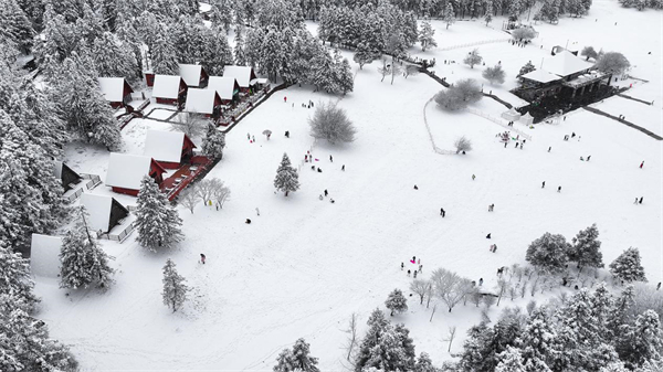 當別的地方都在享受著春日暖陽、百花盛開,仙女山卻一秒穿越回了童話般的冰雪世界。3月6日,輕盈靈動的雪花飄落,給仙女山的山川、樹木、草地都披上了一層潔白的盛裝。遠處的山巒銀裝素裹,在陽光的照耀下,閃爍著迷人的光芒,好似人間仙境。