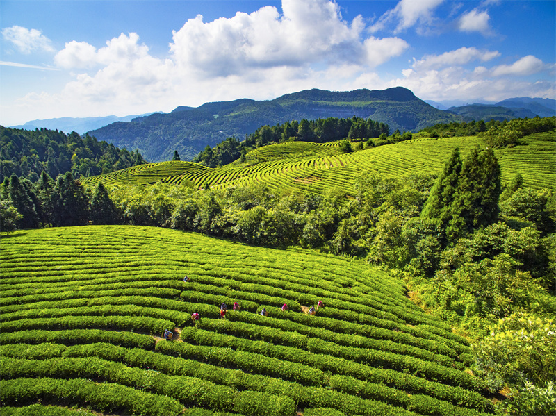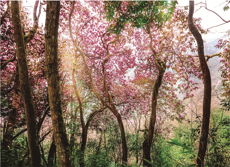 而白馬山的春天,則有著另一番獨特的韻味。沿著山間小道緩緩前行,茶海間的櫻花樹像是被春風喚醒的精靈,紛紛綻放出粉嫩的花朵。一團團、一簇簇的櫻花掛滿枝頭,如云似霧,如夢如幻。微風吹過,花瓣如雨般飄落,灑在肩頭,灑在小徑上,仿佛給整個世界都披上了一層浪漫的粉色薄紗。
