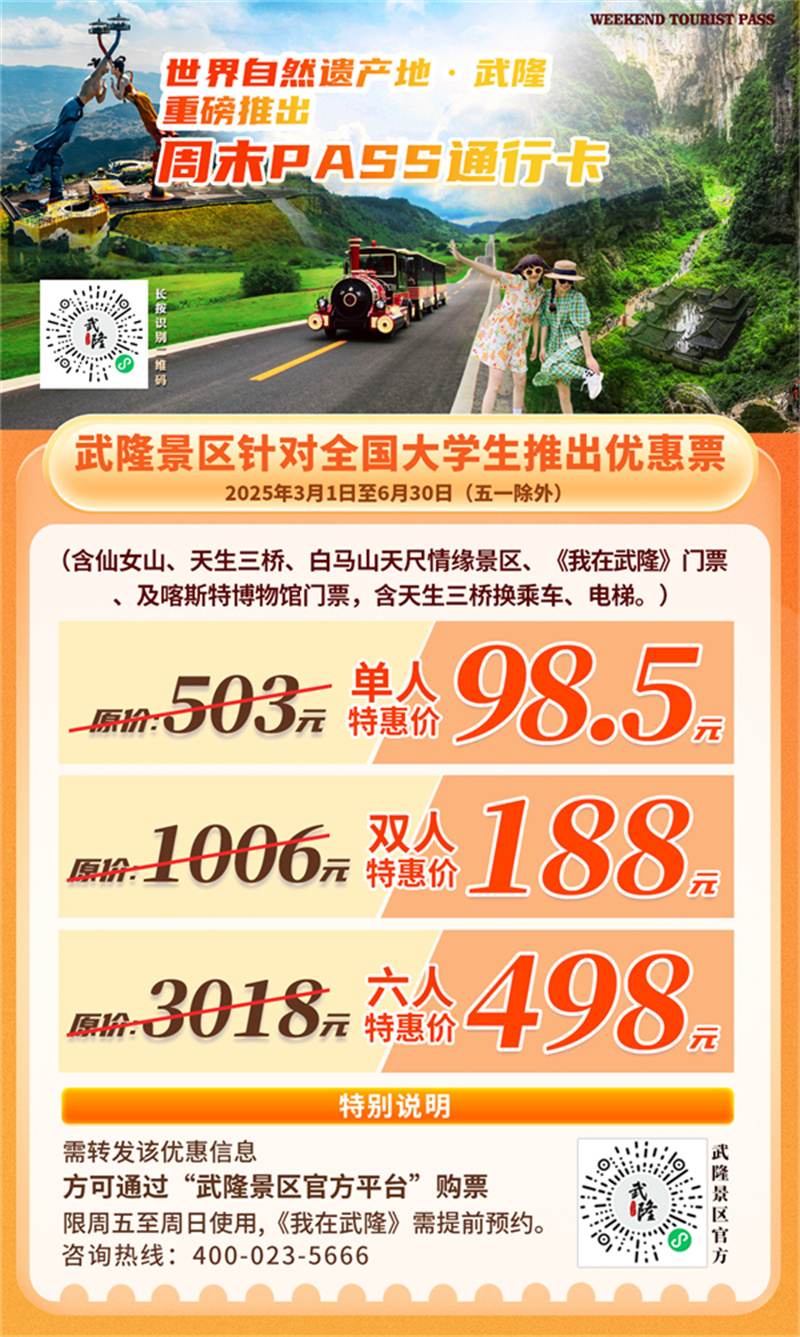 武隆景區針對全國大學生推出了周末PASS通行卡,2025年3月1日至6月30日,單人、雙人及六人套餐,折扣低至1.7折,周五、周六、周日均可使用(五一假期除外)。