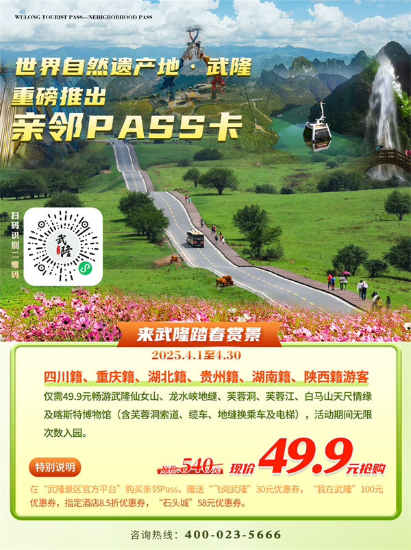 如果你是四川籍、重慶籍、湖北籍、貴州籍、湖南籍、陜西籍的小伙伴,那可太幸運啦!2025年4月1日至4月30日,武隆景區向你們發出春日邀請函,通過轉發分享“武隆景區官方平臺”小程序產品購買頁面,只要49.9元,就能擁有一張價值540元的親鄰Pass套票!這張套票包含了仙女山、龍水峽地縫、芙蓉洞、芙蓉江、白馬山天尺情緣景區以及喀斯特博物館,連芙蓉洞索道、芙蓉江纜車、龍水峽地縫換乘車及電梯都涵蓋在內,并且活動期間憑本人身份證可以無限次數入園。