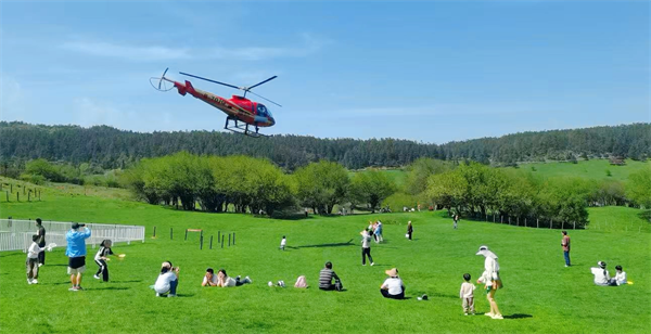 仙女山大草原內直升機呼嘯而上,螺旋槳攪碎云絮,將草原上萬千游客的笑靨織進天幕。游客們舉起手機拍攝,閃光燈此起彼伏。