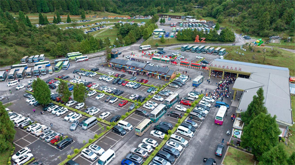 面對如潮的客流,武隆景區在服務保障方面做足準備。在交通疏導上,警察、特警、交巡警全員上崗,在交通要道節點、停車場等地耐心引導車輛。為應對車輛增多的情況,景區設置多個臨時停車場,提供充足車位,并通過合理規劃停車區域,使車輛停放井然有序,形成整齊的“方陣”,讓游客停車便捷又安心。