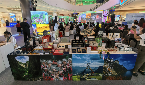 “旅游展臺(tái)”現(xiàn)場(chǎng)鋪設(shè)泰文、英文雙語宣傳冊(cè)及精裝畫冊(cè),詳細(xì)介紹“重慶+武隆”精華線路產(chǎn)品,將“8D魔幻之城”重慶與“世界自然遺產(chǎn)地”武隆完美串聯(lián),勾勒出其獨(dú)特魅力。“非遺展臺(tái)”文創(chuàng)區(qū)則以冰箱貼、折扇等“武隆元素”衍生品傳遞山城詩意,浩口蠟染以靛藍(lán)扎染演繹“山水入布”,仙女紅氤氳著云霧深處的茶香,武隆非遺柴燒制藝讓非遺之美成為可以攜帶的旅行記憶。