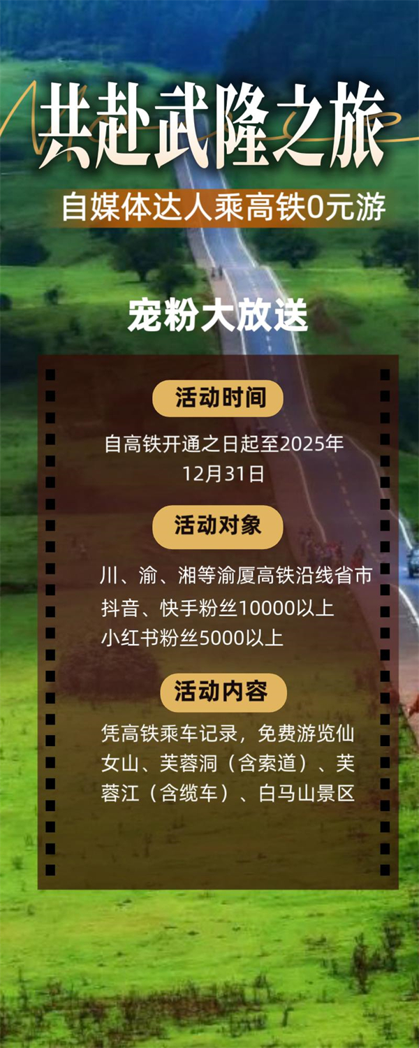 重慶主城?武隆,半小時直達,一碗小面時間輕松切換仙境模式!更重磅的是,乘坐高鐵抵達武隆南站的游客,憑借高鐵乘車記錄,享高鐵PASS專屬優惠,景區交通+游玩一站式,省心又省錢,快人一步暢享清涼!