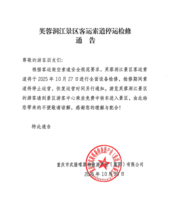 關于芙蓉洞江景區(qū)客運索道停運檢修的通告