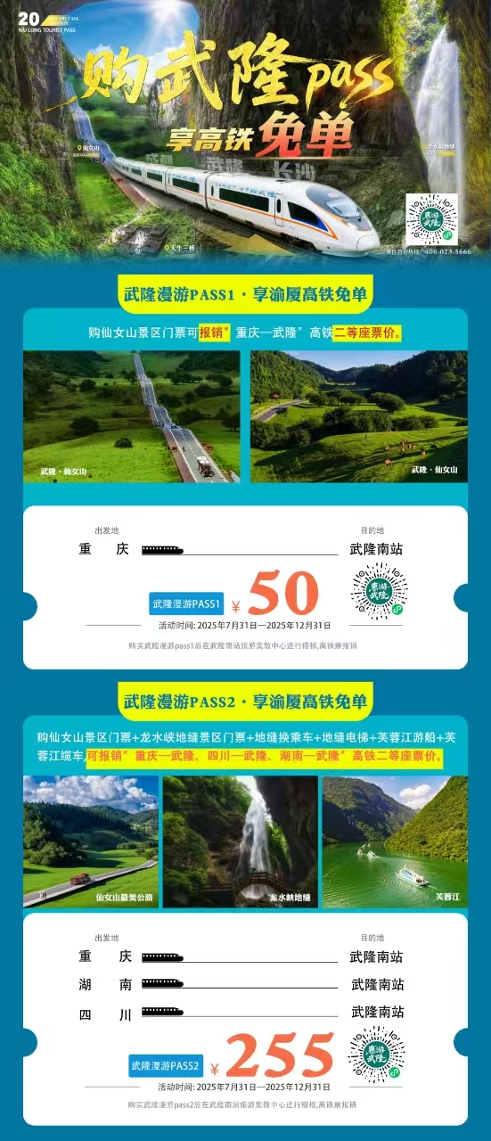 福利二:購買“仙女山+龍水峽地縫+芙蓉江”組合門票,可報銷“重慶/四川/湖南-武隆”段高鐵二等座票價。
