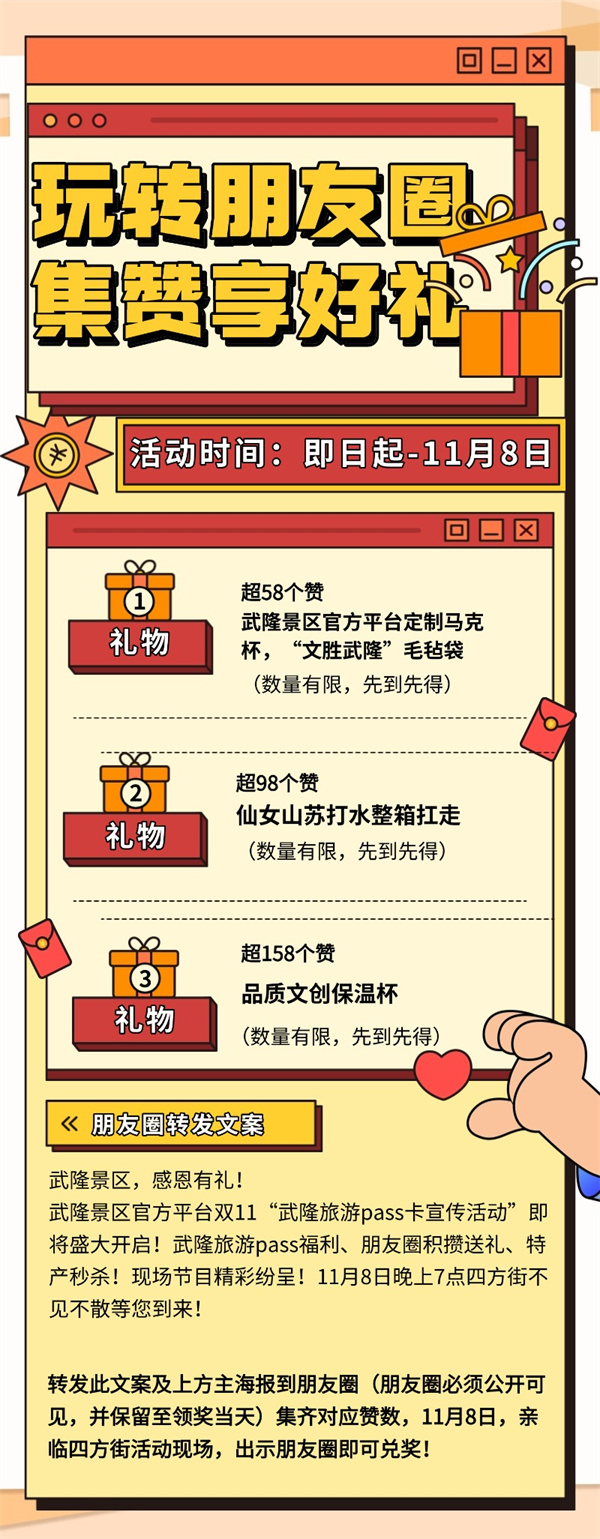 叫上你的小伙伴,11月8日晚,鎖定世紀五龍城四方街,一起為武隆打call,把福利帶回家!