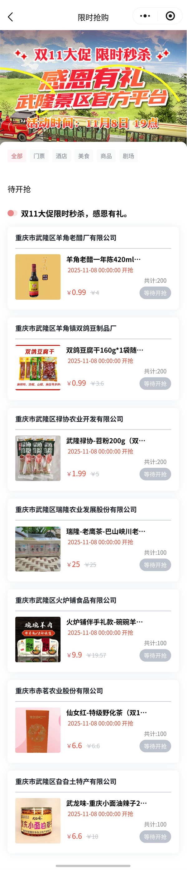 一年一度的“雙11”,武隆景區不玩套路,只放福利!本周六,武隆景區準備了一場線下寵粉狂歡,就為了跟你見個面,把實實在在的好禮送到你手里!轉發朋友圈就能白嫖定制好禮,現場還能搶0.99元武隆特產…你準備好了嗎?