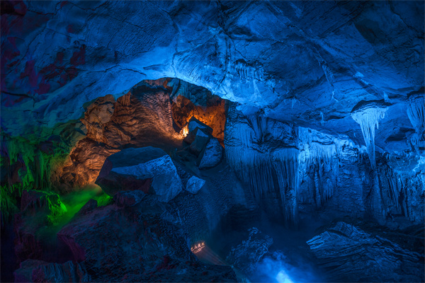 芙蓉洞巧妙地運用了人工水波紋燈和雙調燈光等現代光影技術。當燈光亮起,柔和而變幻的光線投射在嶙峋的石壁上,模擬出如水波流動、雨絲灑落的動態景象。霎時間,原本靜止的巖壁仿佛被秋夜的雨水打濕,光影在其上跳躍、流淌,形成一片波光粼粼、如夢似幻的視覺奇觀。