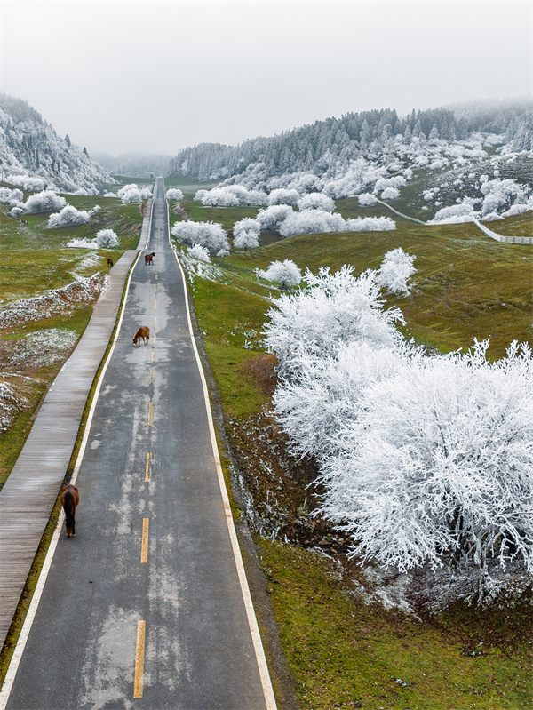 霧凇與光影的冬日奇觀:雪后的仙女山,常有令人驚嘆的絕景。漫山遍野的霧凇(樹掛)如玉樹瓊枝,在陽光下閃爍著晶瑩的光芒。