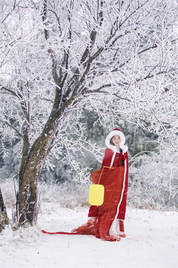 選一棵掛滿冰霜的蒼勁古樹,身著紅色斗篷,手提一盞復古燈籠。讓暖黃的光暈柔和地映在臉上,紅衣與白雪形成驚艷對比。