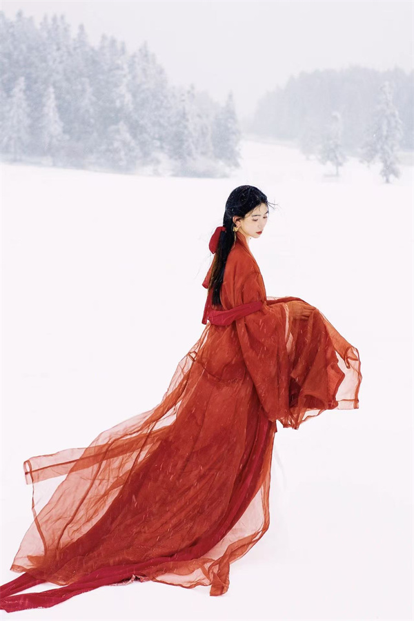 于一片純凈空曠的雪地中,輕舒廣袖,緩緩旋轉。披風或裙擺隨之鋪展,動作不必劇烈,意在捕捉那份輕盈與飄逸。低頭頜首,或揚手接取漫天雪花,這是讓靜態雪景充滿生命力的絕佳姿勢。