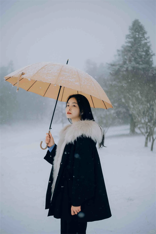 放棄繁復,選擇最經典的黑白搭配。黑色外套與白色圍巾形成強烈對比,在純白雪景中格外醒目。可背對鏡頭走向遠方,或側身站立,讓簡約的服飾與純凈的雪景相映成趣。
