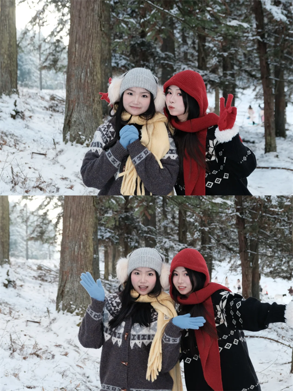 與閨蜜穿著同色系不同款式的冬裝,在雪地里嬉戲打鬧。嘗試錯落站位,或同時回眸,管理好你們的微表情,拍出的照片直接填滿朋友圈九宮格。