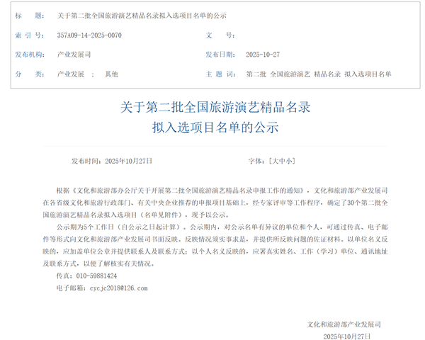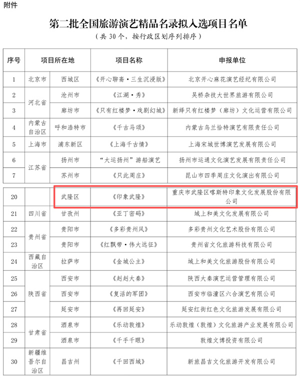 近日,文化和旅游部正式公布第二批全國旅游演藝精品名錄,全國30個項目脫穎而出。其中,大型山水實景演出《印象武隆》憑借獨特的文化內(nèi)核與藝術(shù)魅力成功入選。