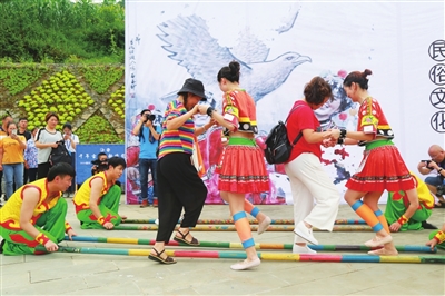 游客在田家寨體驗民族舞蹈。