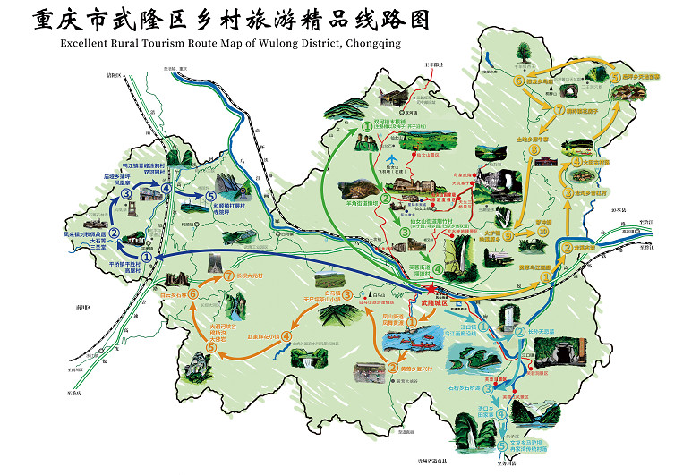 線路推薦:武隆城區(qū)或重慶主城—平橋鎮(zhèn)平勝村、高屋村—鳳來鎮(zhèn)劉秋佩故居、大石箐、三圣堂—廟埡鄉(xiāng)蒲坪、鳳凰寨—鴨江鎮(zhèn)青峰涂鴉村、雙河園村—和順鎮(zhèn)打蕨村、寺院坪。