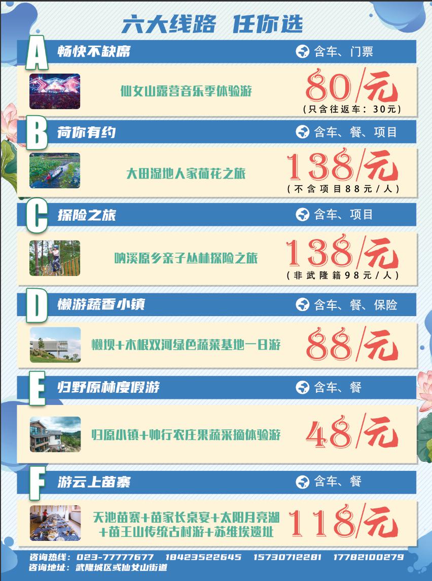 此外,武隆鄉(xiāng)村旅游還推出多種線路產(chǎn)品,仙女山音樂季體驗游、吶溪原鄉(xiāng)親子叢林探險之旅、大田濕地人家荷花之旅等等,48元—138元價格不等,滿足不同游覽需求。