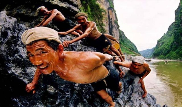 當(dāng)貨船起坎上岸后,纖夫拉船靠的是精誠合作的氣勢,人在懸崖每走一步都需要付出巨大的力氣。流淌的江水非常急,只見纖夫們手扒亂石腳蹬沙,目光如炬,熱血噴張,青筋暴出,把惡浪強壓。“嗨呀做,嗨呀做——”濤聲如雷,卻抵不過纖夫們雄渾的號子聲。